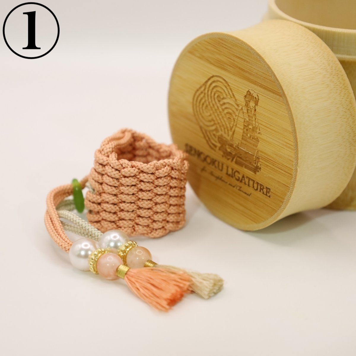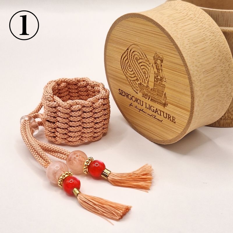 A ligature for saxophone and clarinet made with 100% handmade “premium braided cord (Kumihimo)”.