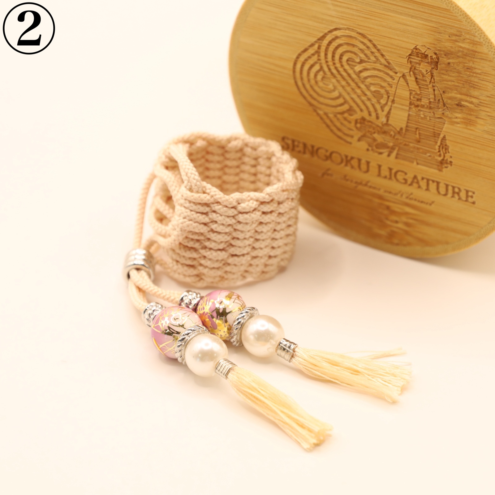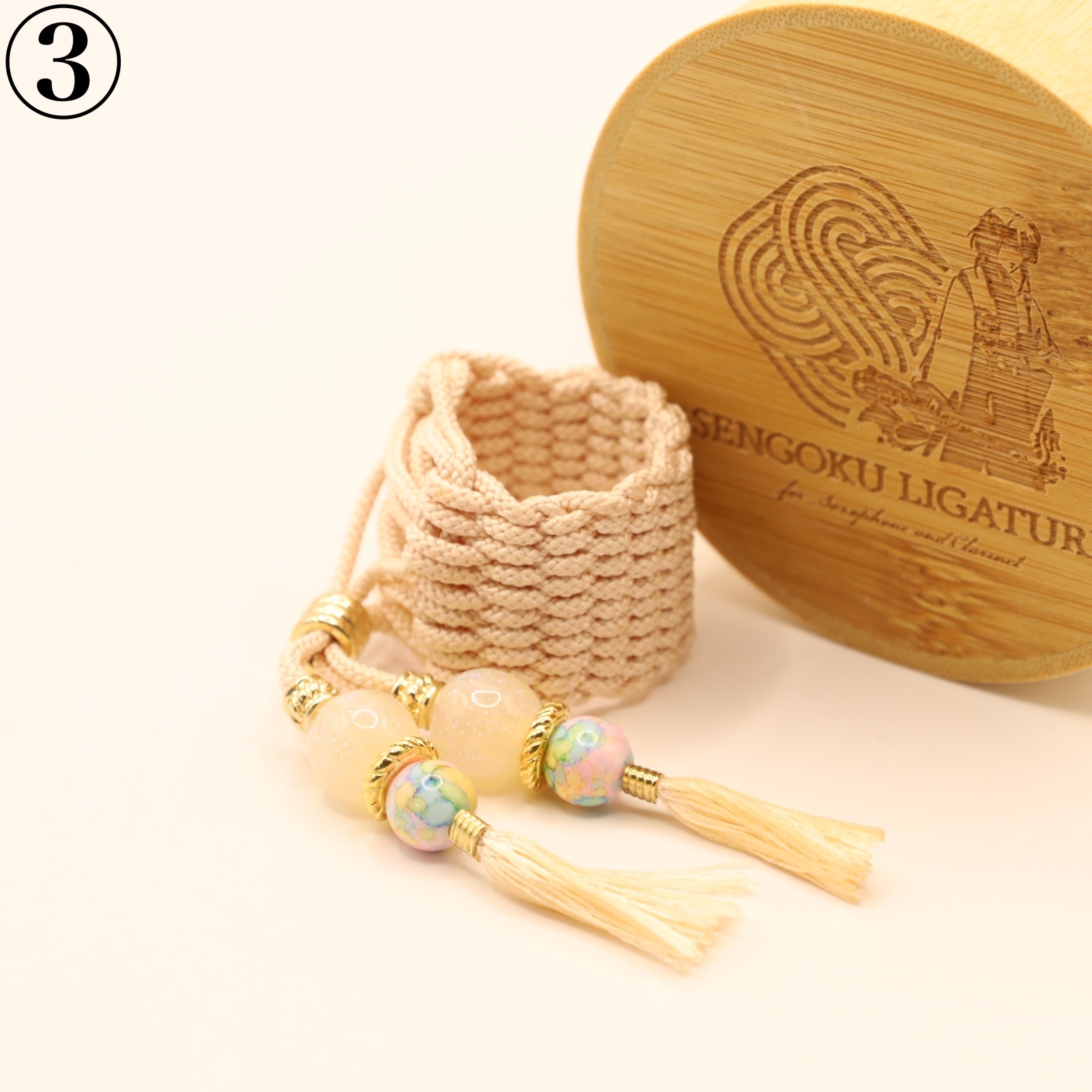 A ligature for saxophone and clarinet made with 100% handmade “premium braided cord (Kumihimo)”.