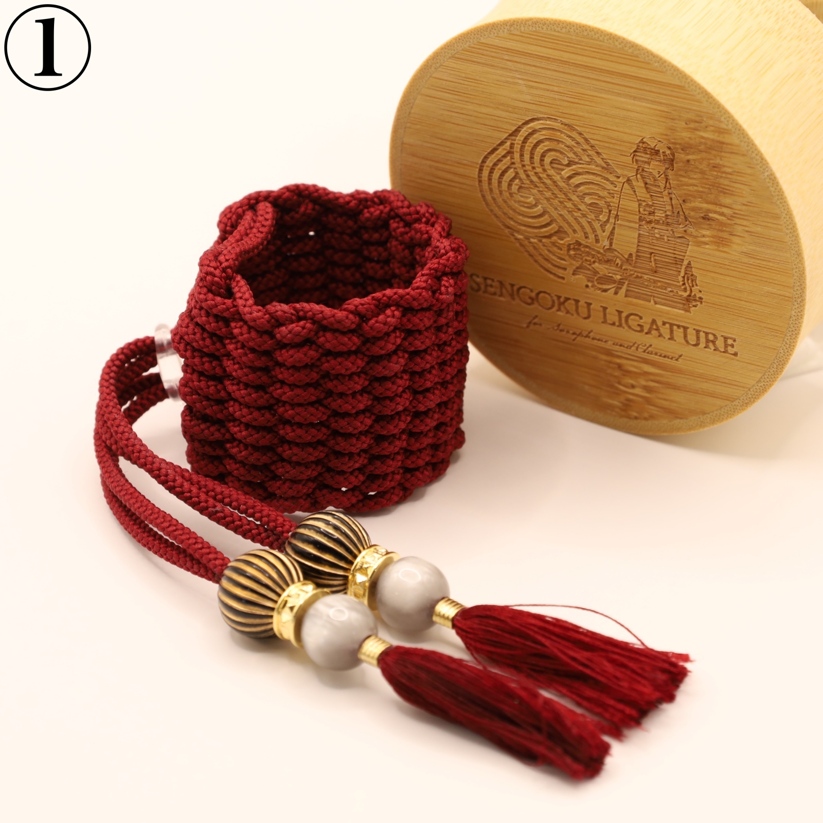 A ligature for saxophone and clarinet made with 100% handmade “premium braided cord (Kumihimo)”.
